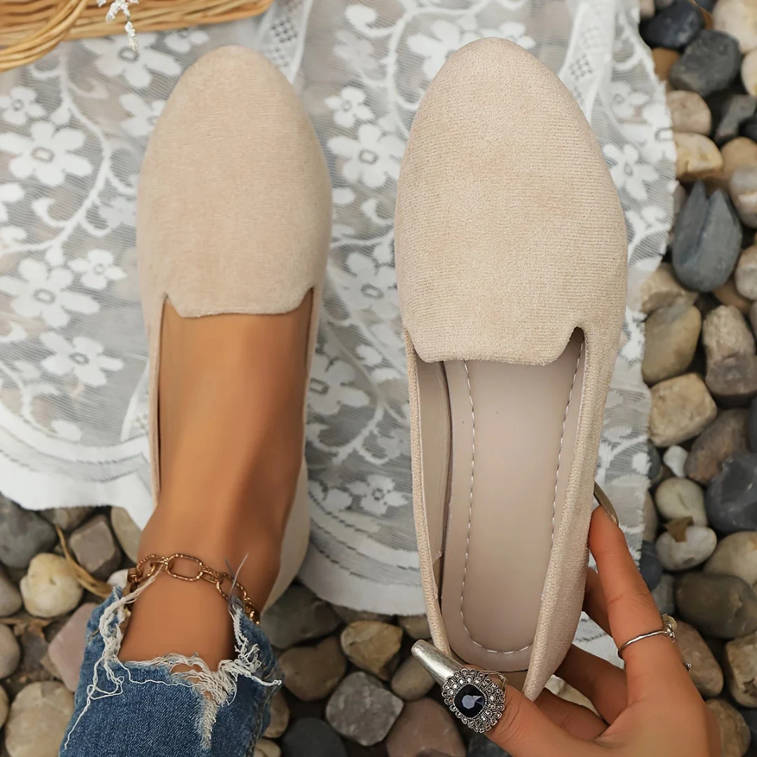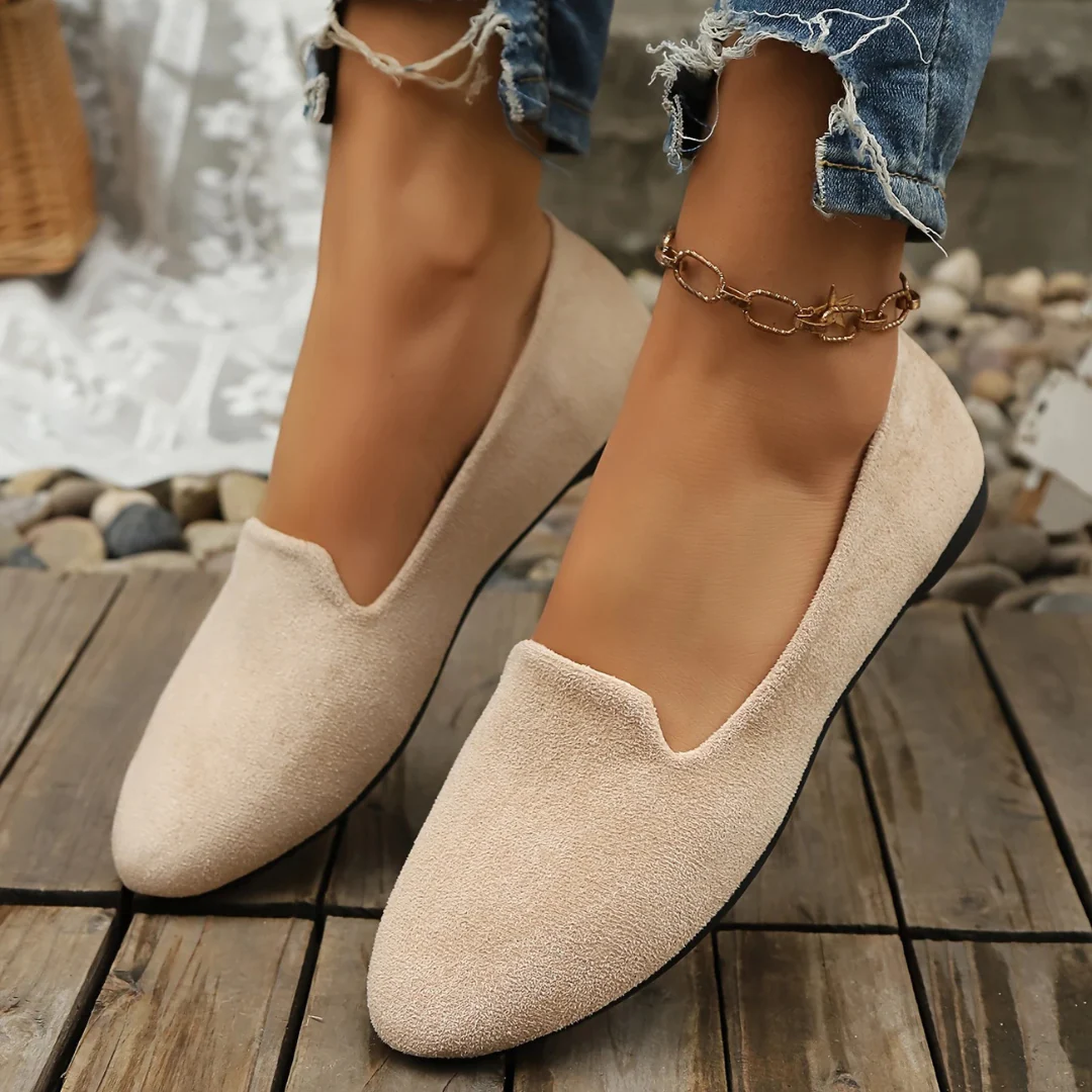 Con puntera redondeada y acabado aterciopelado, estos zapatos estilo bailarina aportan un aire delicado y contempor谩neo, perfecto para quienes valoran la elegancia en el d铆a a d铆a.
