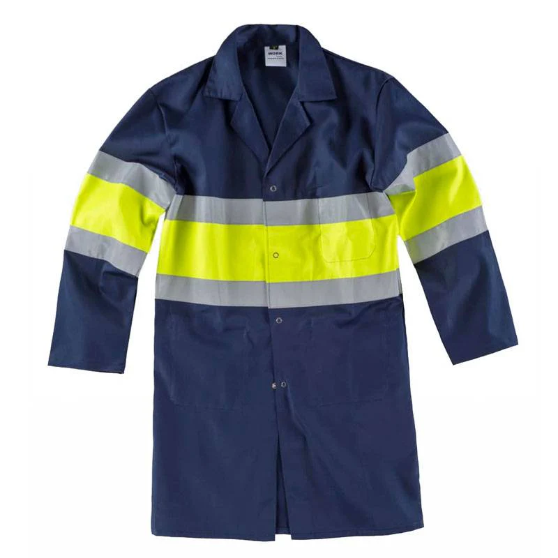 Bata blanca con cierre de botones ocultos, sin bolsillos exteriores, con un bolsillo de pecho interior y dos laterales interiores.Combinada alta y visibilidad y cintas reflectactes.