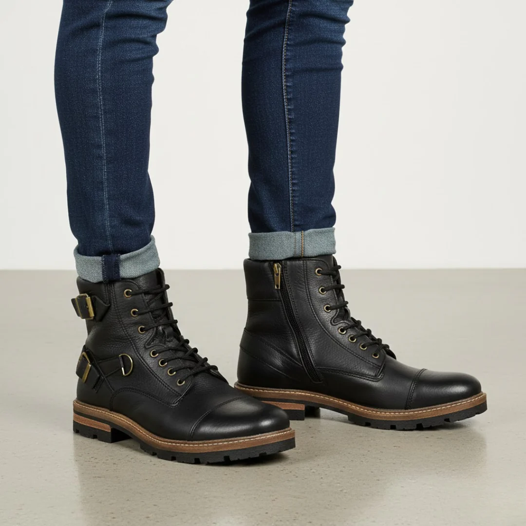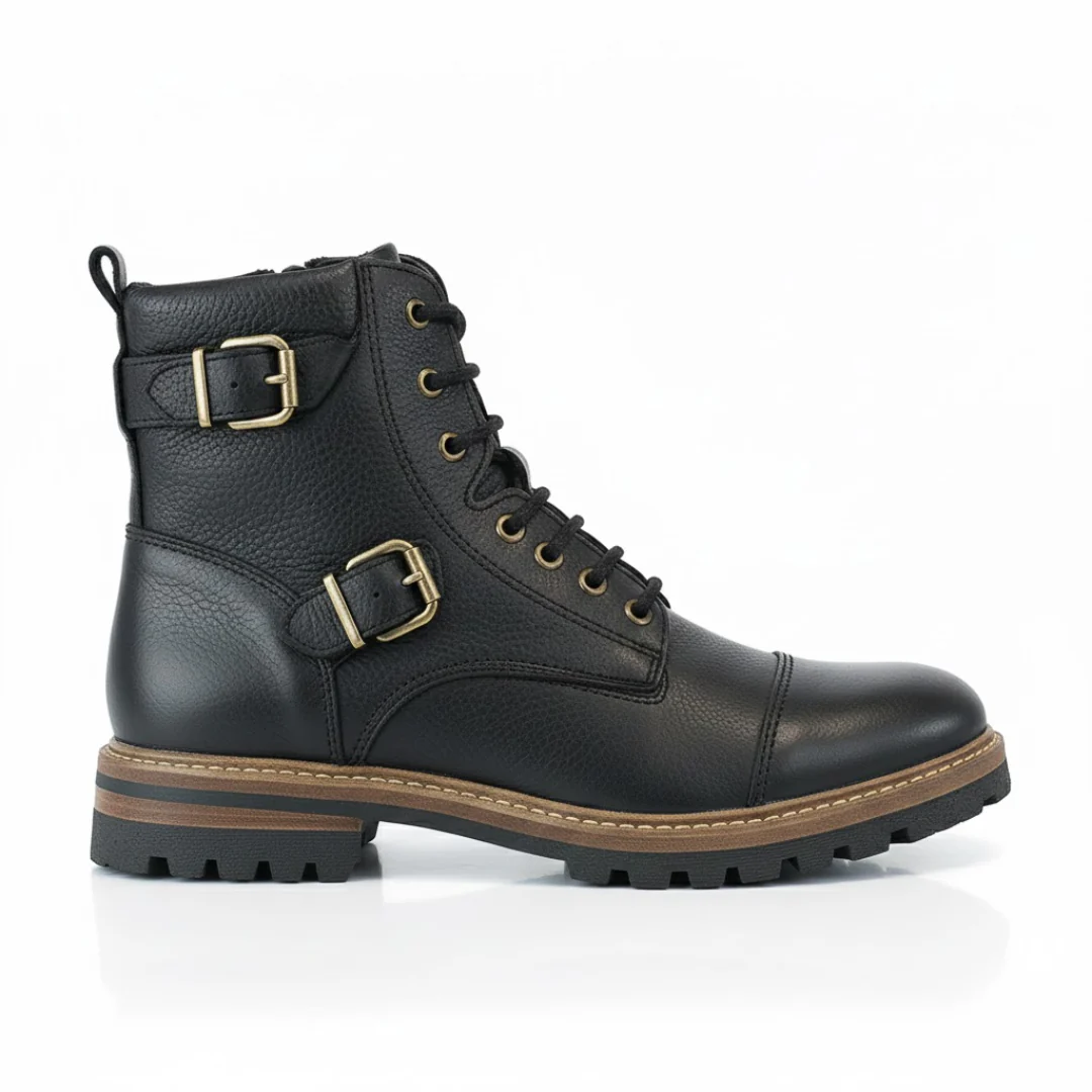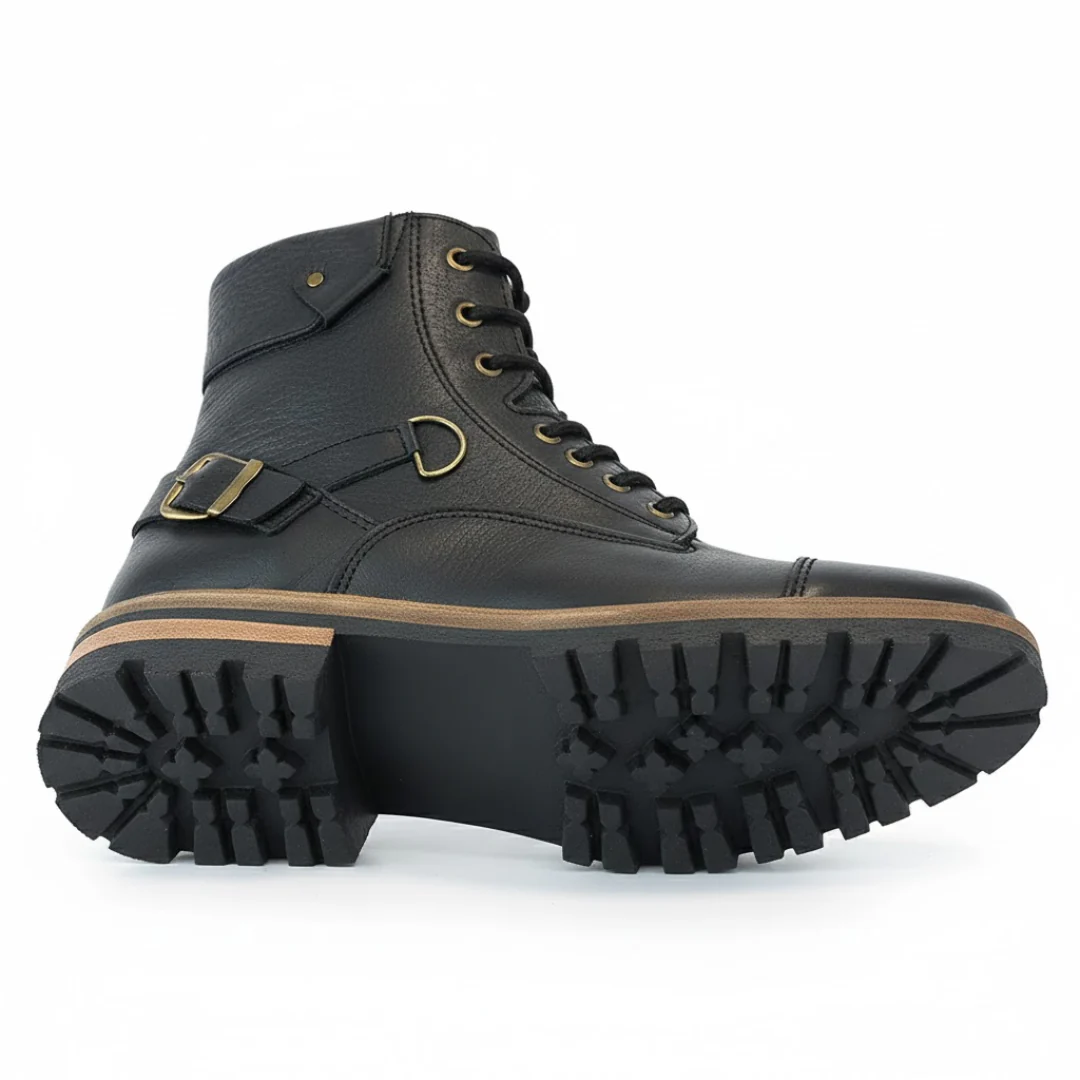 Estas botas capturan la esencia del estilo militar y motard, combinando durabilidad y una presencia inigualable. El dise帽o de ca帽a alta, el cuero negro texturizado y la puntera reforzada ofrecen una silueta poderosa, ideal para el hombre que exige car谩cter en su calzado.
