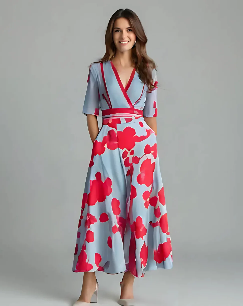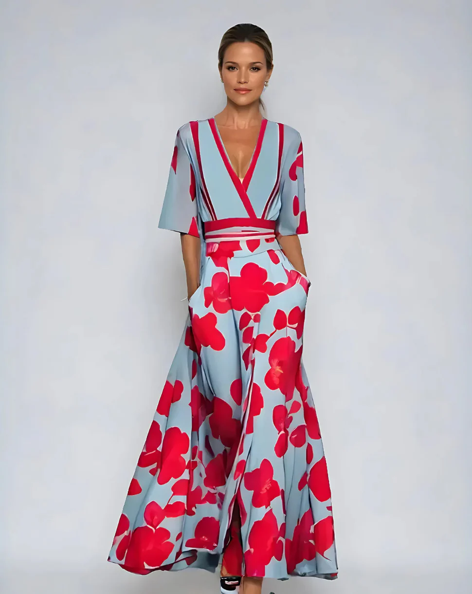 La combinaci贸n de suaves tonos azules y flores rojas brillantes crea un aspecto fresco y elegante, perfecto tanto para ocasiones formales como informales.