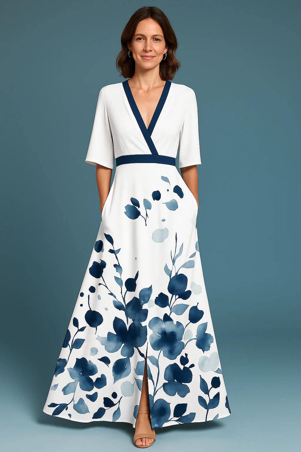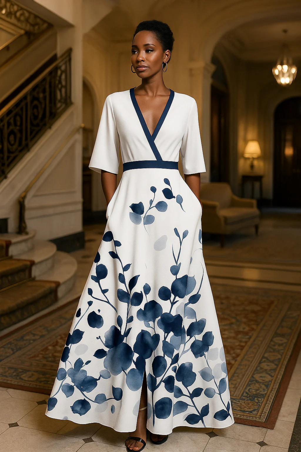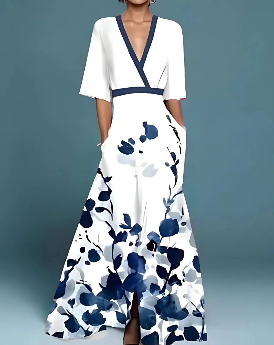 El escote en V profundo y la cintura ajustada acent煤an tu silueta, mientras que la falda fluida proporciona un look glamuroso sin esfuerzo.