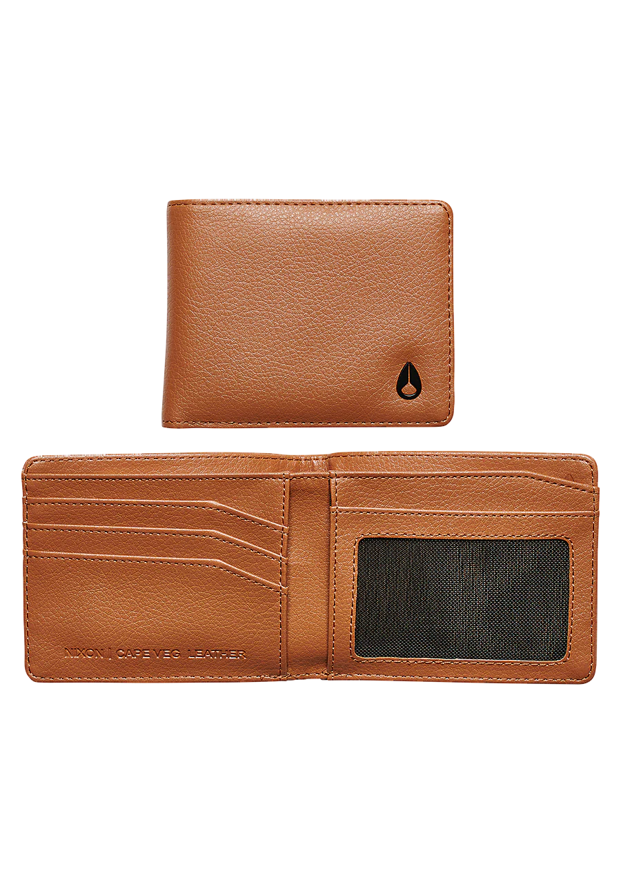 Cartera de cuero vegano con interior estampado. Incluye compartimento para billetes de f谩cil acceso, funda de malla para DNI y remache met谩lico con el logotipo en la parte delantera.