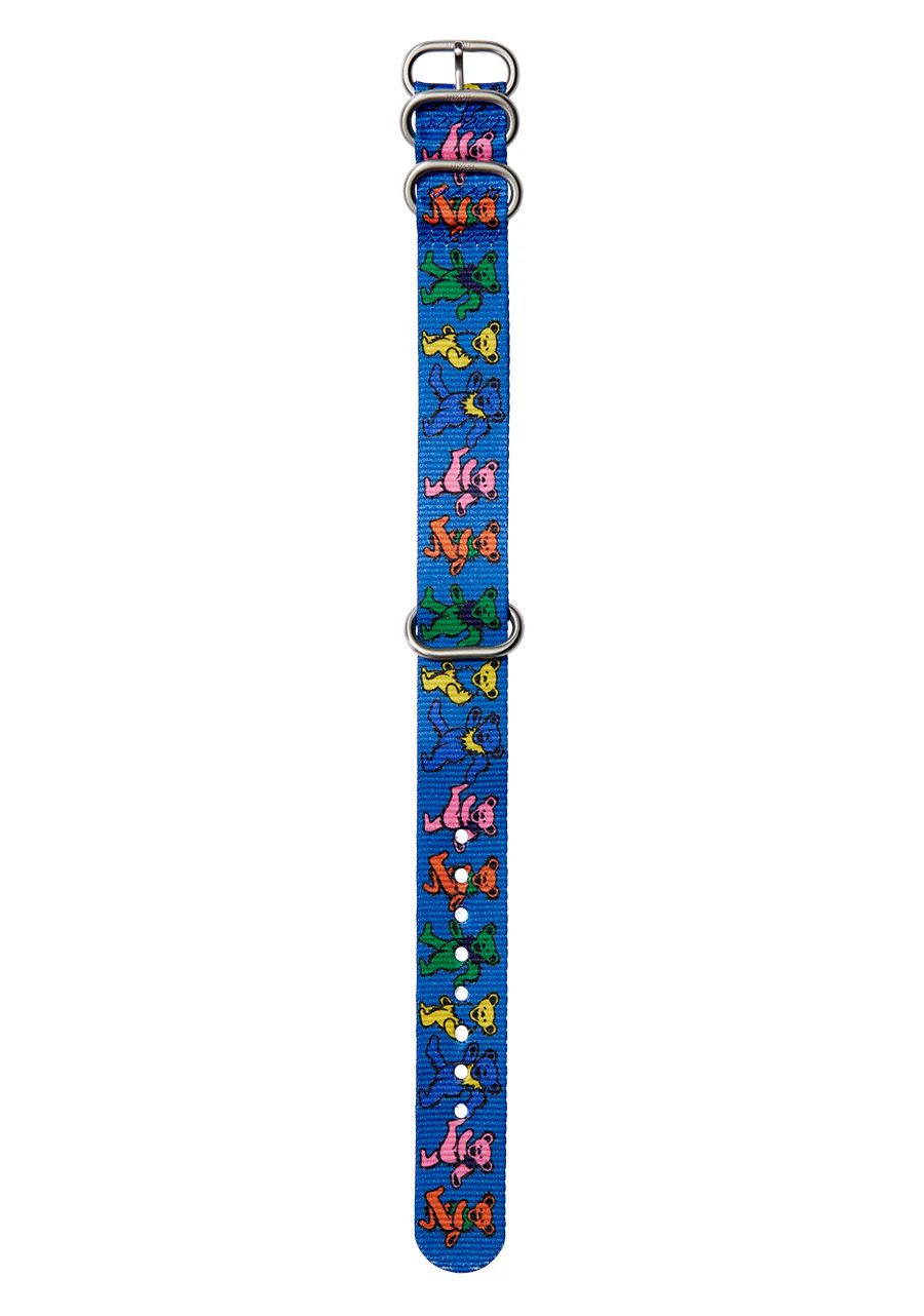 Pas茅ate con una correa NATO reciclada de los Grateful Dead con osos marchando. Estos ic贸nicos dise帽os NATO, ligeros y fabricados de forma sostenible, se ajustan perfectamente para pasar a la acci贸n.