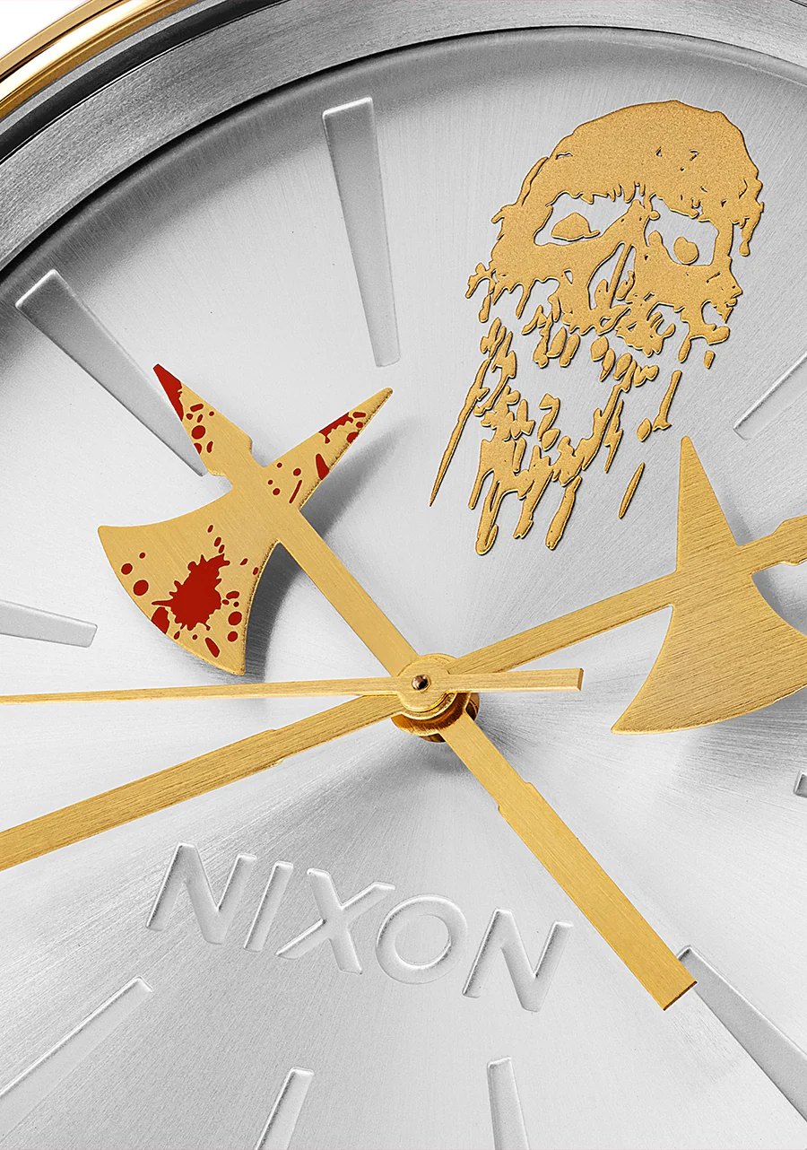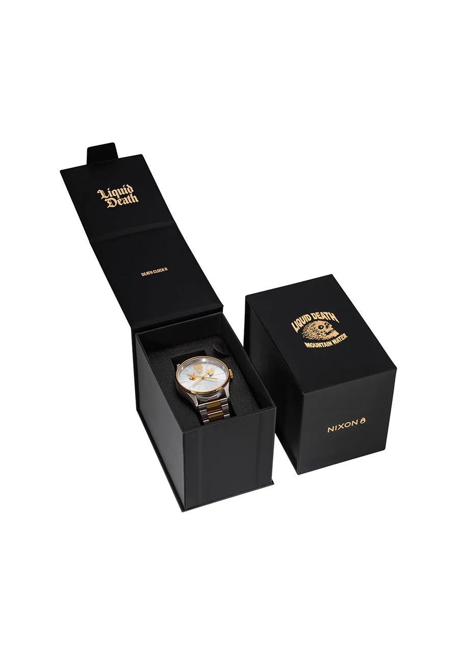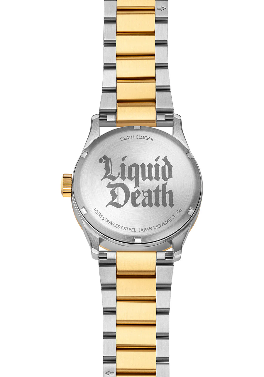 Liquid Death y Nixon presentan un reloj para el 0.1%: el Death Clock II. Cada uno de los eslabones de oro de su correa est谩 ensamblado a mano por demonios de comercio justo que fueron criados exclusivamente con una dieta de bellotas negras. Y los ejes dorados que representan las horas y los minutos fueron forjados en un r铆o de sangre en lo profundo de las Monta帽as Glorgoroth.