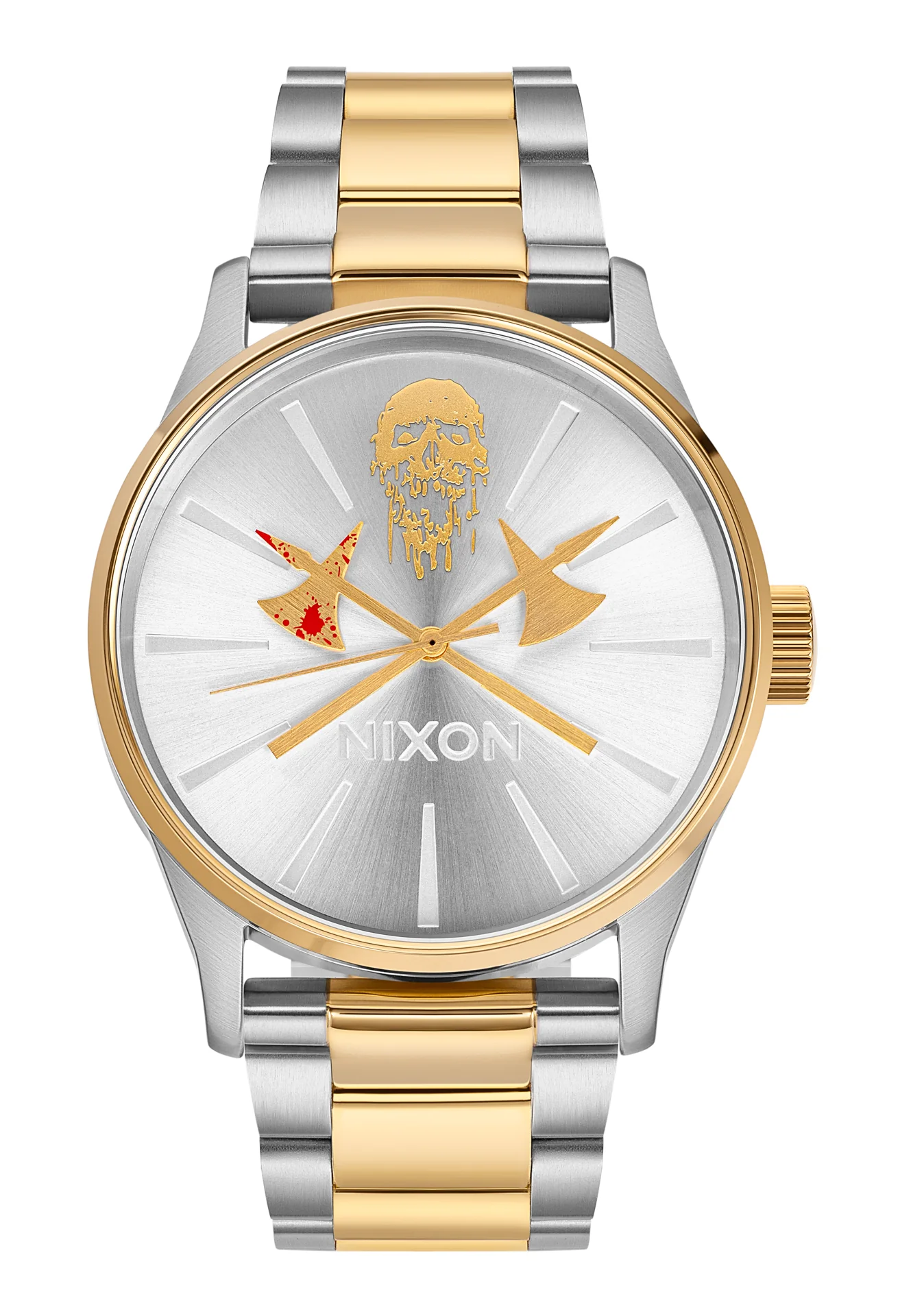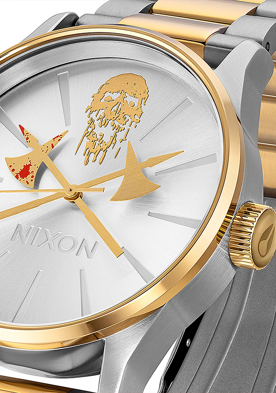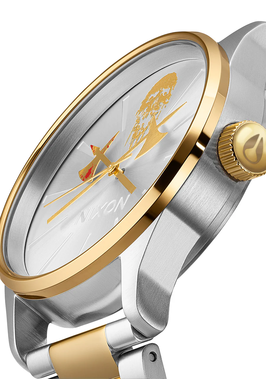 Liquid Death y Nixon presentan un reloj para el 0.1%: el Death Clock II. Cada uno de los eslabones de oro de su correa est谩 ensamblado a mano por demonios de comercio justo que fueron criados exclusivamente con una dieta de bellotas negras. Y los ejes dorados que representan las horas y los minutos fueron forjados en un r铆o de sangre en lo profundo de las Monta帽as Glorgoroth.