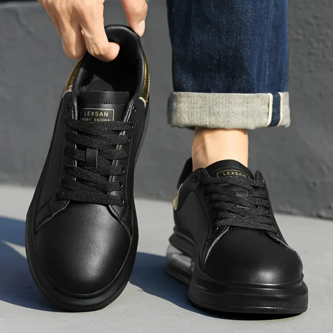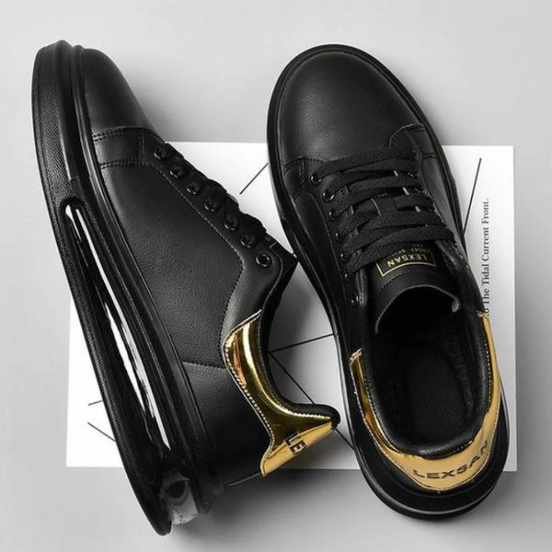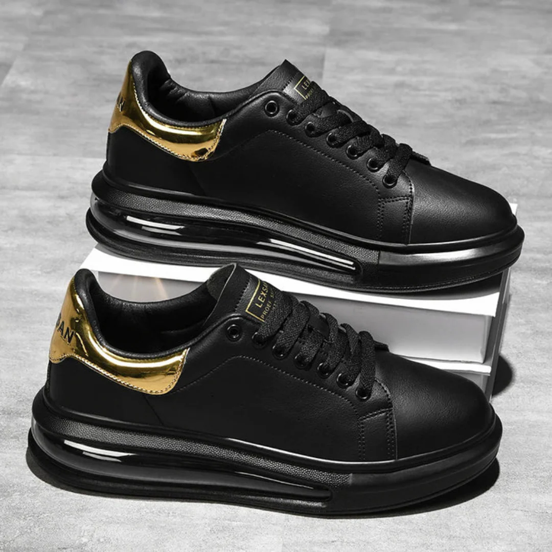 Zapatillas de cuero negro con detalles dorados y suela deportiva
